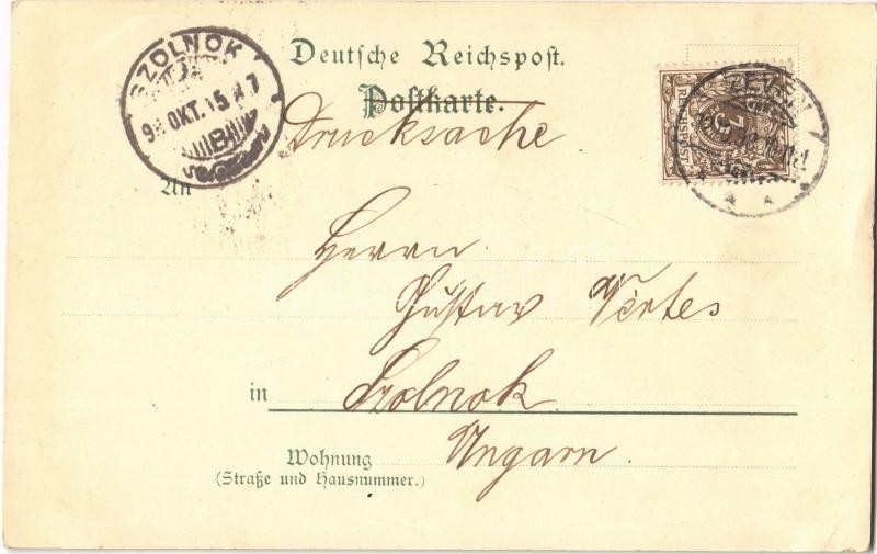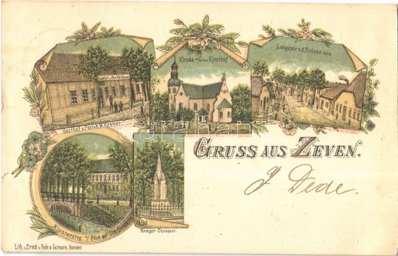 1898 Zeven, Kirche mit alten Kirchhof, Langestrasse, Krieger Denkmal, Klostersteg, Oberförsterei, Gasthof z. Post von H.W. Kramer / church, street, military heroes monument, restaurant. Rode & Germann Art Nouveau, floral, litho