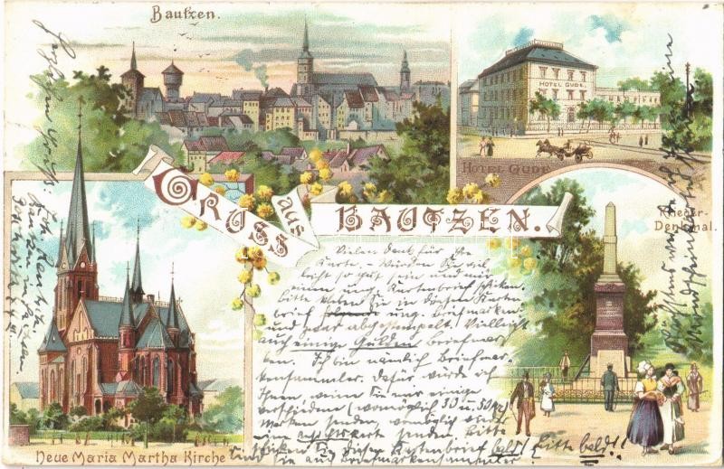 Leírás: 1899 Bautzen, Hotel Gude, Krieger Denkmal, Neue Maria Martha Kirche / hotel, military heroes monument, new church. Art Nouveau, floral, litho