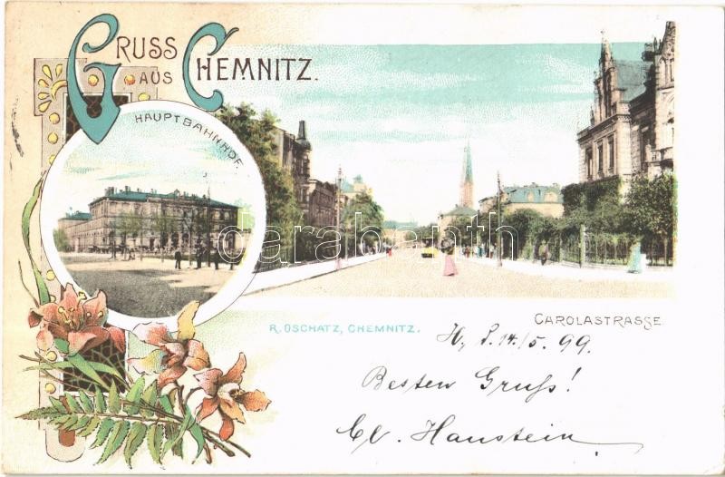 Leírás: 1899 Chemnitz, Hauptbahnhof, Carolastrasse / main railway station, street. R. Oschatz Art Nouveau, floral, litho