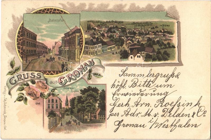1899 Gronau, Bahnhofstrasse, Unter den Linden / streets. Joh. Schievni... https://www.darabanth.com/hu/32-Nagyaukcio/32.1/Kepeslapok/Nemetorszag~13772/1899-Gronau-Bahnhofstrasse-Unter-den-Linden-streets-Joh-Schievnik-Art-Nouveau-floral-litho~II2046751
