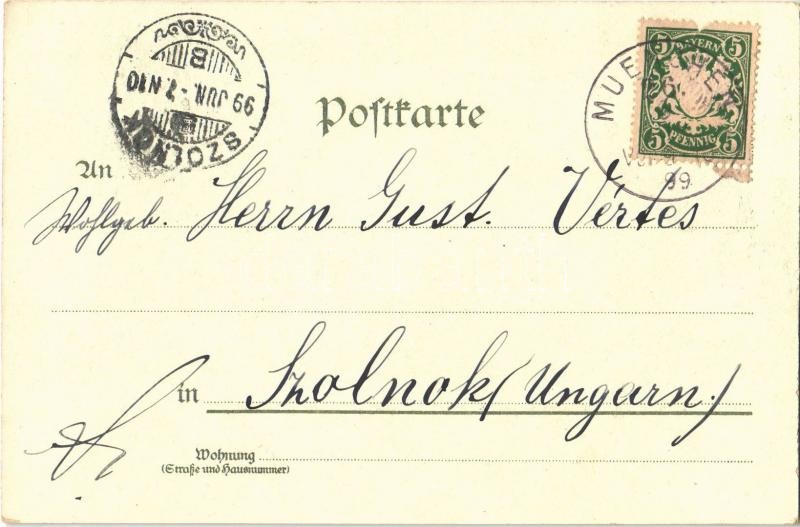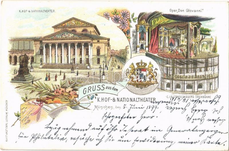 1899 München, Munich; K. Hof. Nationaltheater, Oper "Don Giovanni", C. Lautenschläger's Drehbühne / theatre interior with opera, coat of arms. Kunstanst. Carl Leykum Art Nouveau, floral, litho