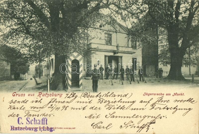 Leírás: 1899 Ratzeburg, Jägerwache am Markt / military barracks with soldiers (EK)