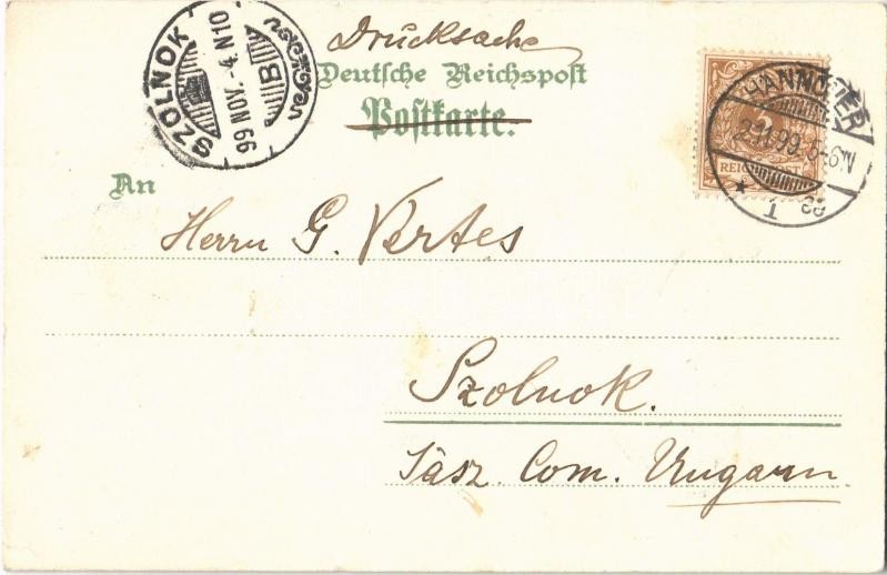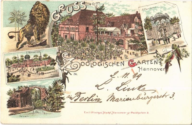 Leírás: Hannover, Hanover; Gruss vom Zoologischen Garten, Affenhaus, Felsen, Kamelhäus / zoo, monkey and camel houses, rocks, lion. Emil Pinthus Art Nouveau, floral, litho (EK)