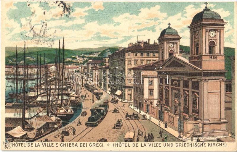 1901 Trieste, Trieszt; Hotel de la Ville e Chiesa dei Greci / town hal... https://www.darabanth.com/hu/32-Nagyaukcio/32.1/Kepeslapok/Olaszorszag~13774/1901-Trieste-Trieszt-Hotel-de-la-Ville-e-Chiesa-dei-Greci-town-hall-church-quay-and-industrial~II2046737
