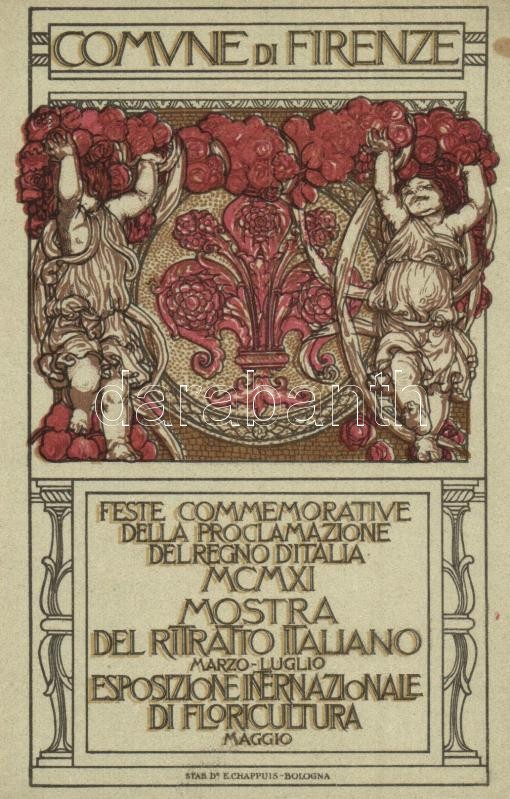 1911 Comune di Firenze, Feste Commemorative della Proclamazione del Regno d'Italia, Mostra del Ritratto Italiano, Esposizione Internazionale di Floricultura. Stab. Dr. E. Chappuis / Commemorative Festivals of the Proclamation of the Kingdom of Italy, Exhibition of the Italian Portrait, International Exhibition of Floriculture. Art Nouveau litho