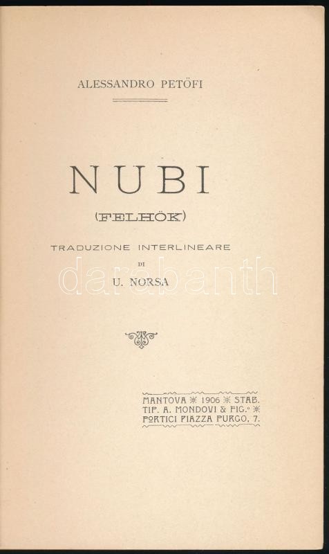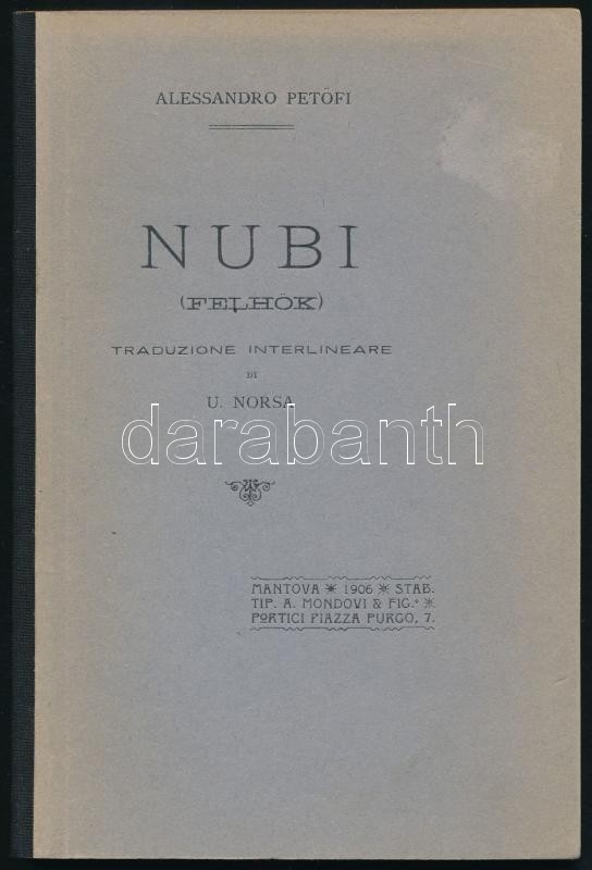 Alessandro Petőfi: Nubi (Felhők). Mantova, 1906. Mondovi & Fig. Ki... https://www.darabanth.com/hu/32-Nagyaukcio/32.1/Konyvek/Konyvek-Egyeb-ritkasagok~13390/Alessandro-Petofi-Nubi-Felhok-Mantova-1906-Mondovi-Fig-Kiadoi-papirkotesben~II2032857