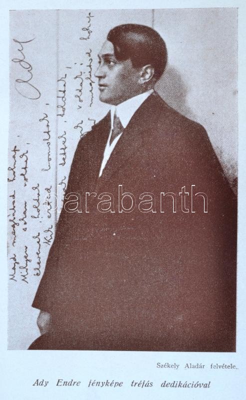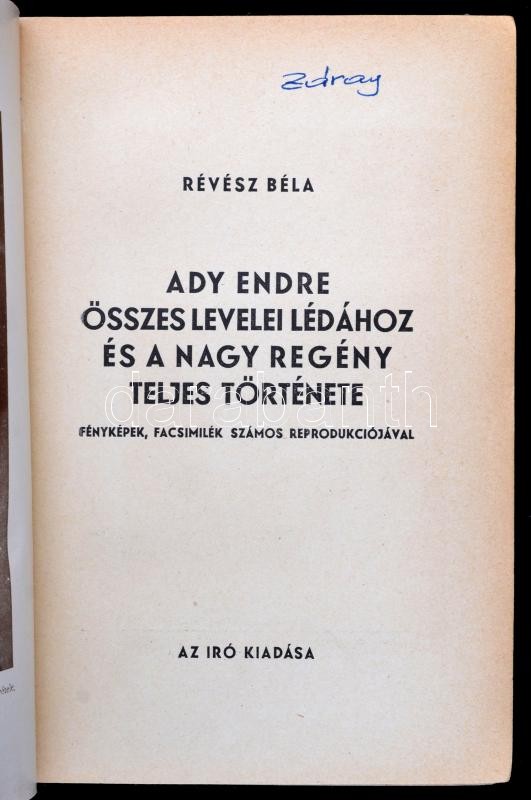 Révész Béla: Ady Endre összes levelei Lédához és a nagy regény teljes története fényképek, facsimilék számos reprodukciójával. Bp., 1942, Szerzői kiadás, 608 p.+13 t. Kiadói félvászonkötésben, kissé kopott borítóval, kissé sérült gerinccel.