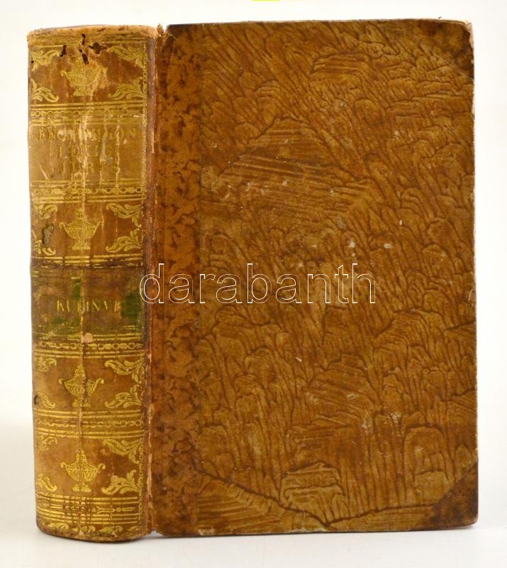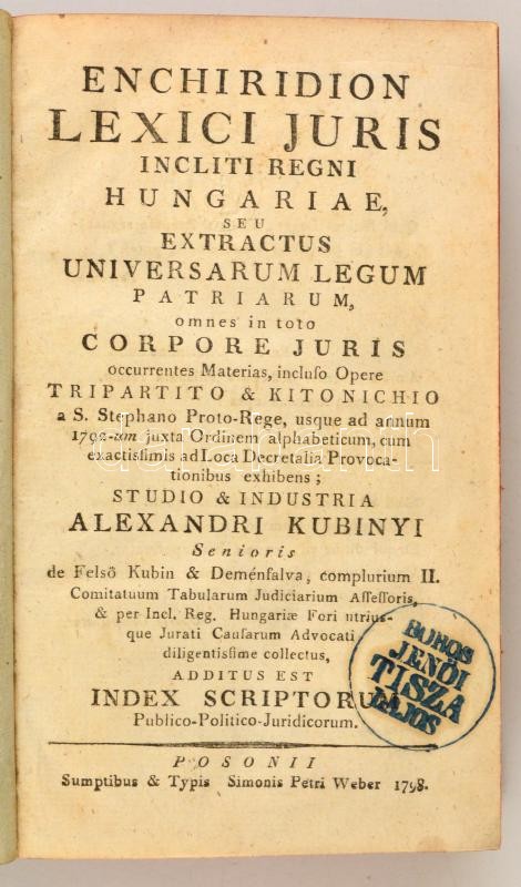 [Kubinyi Sándor] Alexandrus Kubinyi: Enchiridion Lexici Juris Incliti Regni Hungariae, seu extractus universarum legum patriarum, omnes in toto Corpore Juris occurentes Materias, incluso Opere Tripartito & Kitonichio... Posonii [Pozsony], 1798, Sumptibus & Typ. Simonis Petri Weber, VIII+824 p. Latin nyelven. Korabeli aranyozott gerincű félbőr-kötés, kissé kopott borítóval, a gerincen apró molyrágta lyukakkal, de egyébként belül szép, megkímélt állapotban. A címlapon borosjenői és szegedi Tisza Lajos (1832-1898) politikus, miniszter, kormánybiztos, Tisza Lajos (1798-1856) politikus, Bihar vármegyei alispán, majd főispáni helytartó fiának, Tisza Kálmán (1830-1902) politikus, miniszterelnök testvérének, Tisza István (1861-1918) politikus, miniszterelnök nagybátyjának névbélyegzőjével, valamint Tisza Lajos koronás, 'persevero' feliratos szárazbélyegzős monogramjával az elülső előzéklapon./ In Latin language. Gilt half-leather-binding, with little bit worn cover, with little holes from moths on the spine, but the other things are okay, in good condition. With the name stamps of Lajos Tisza (1798-1856), the brother of Kálmán Tisza (1830-1902) and the uncle of István Tisza (1861-1918) politician, prime minister of Hungary.