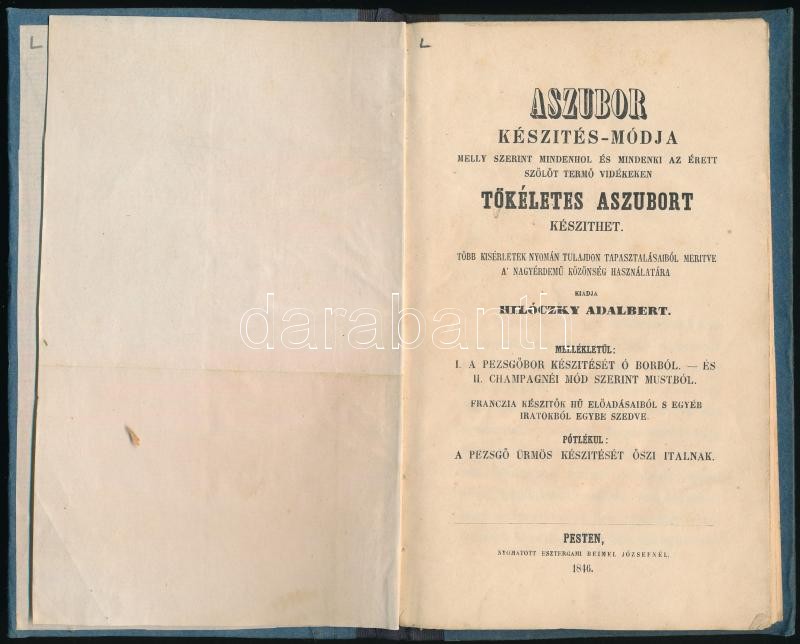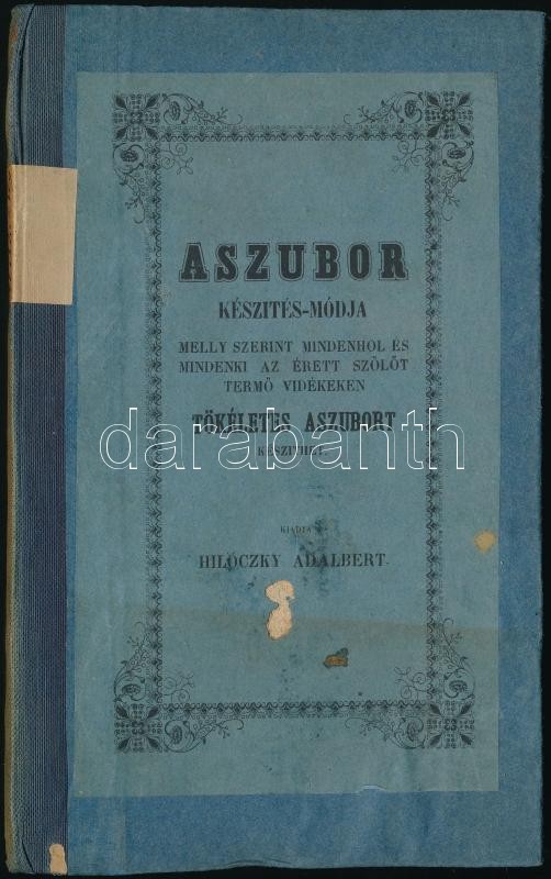 Hilóczky Adalbert (1802-1883): Aszubor készítés-módja, mely szerint mindenhol és mindenki az érett szőlőt termő vidékeken tökéletes aszubort készíthet. Több kisérletek nyomán tulajdon tapasztalásaiból merítve a nagy érdemű közönség használatára. Mellékletül: I. A pezsgőbor készítését ó-borból és II. Champagnéi mód szerint mustból. Franczia készítők hű előadásaiból s egyéb iratokból egybe szedve. Pótlékul: A pezsgő ürmös készítését őszi italnak. Pest, 1846, Esztergami Beimel József, 38+2 p. Későbbi átkötött félvászon-kötés, az eredeti papírborítót az átkötéskor felhasználták, a borítón apró kopásnyomokkal, a gerincen és a borítón apró sérülésekkel, de belül jó állapotban. Nagyon ritka! Aukción még nem szerepelt./ Adalbert Hilóczky:How to make Aszu Wine. Pest, 1846, Josef Beimel of Esztergam, 38+2 p. In Hungarian language. Half-linen-binding, with little bit worn cover, and little damages on the spine and the cover, but the other things are okay. Very Rare!