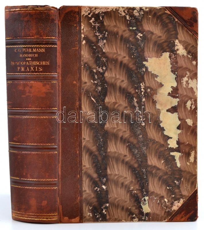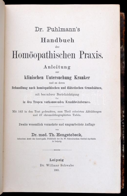 Dr. Puhlmann's Handbuch der Homöopathischen Praxis. Anleitung zur klinischen Untersuchung Kranker und zu deren Behandlung nach homöopathischen und diätetischen Grundsätzen, mit besonderer Berücksichtigung der in den Tropen vorkommenden Krankheitsformen. Leipzig, 1901, Dr. Willmar Schwabe, XX+755+1+15+1 p. +2+45 t. (színes litográfiák, ebből 45 növényeket ábrázoló tábla.) Szövegközti illusztrációkkal. Német nyelven. Félbőr-kötésben, márványozott lapélekkel, kopott borítóval, kissé kopott gerinccel. /Half-leather-binding, with little bit worn spine, and worn cover, in German language.