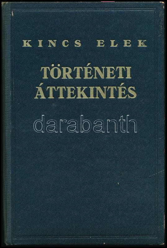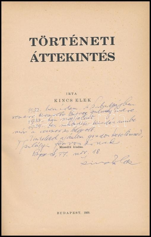 Dr. Kincs Elek: Történeti áttekintés. Általános Ismeretek Kézikönyve különlenyomata. Bp.,1939,(Merkantil-ny.) Második kiadás. Kiadói aranyozott egészvászon-kötés. A szerző dedikációjával, és ajándékozási soraival./ Linen-binding, in Hungarian languae. Signed by the author.
