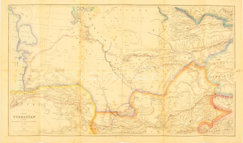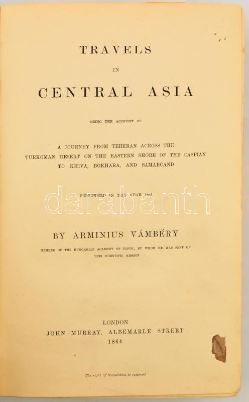 Vámbéry Ármin (1831-1913): Travels in Central Asia. Being the Account of a Journey from Teheran Across the Turkoman Desert on the Eastern Shore of the Caspian to Khiva, Bokhara, and Samarcand. Performed in the Year 1863. London, 1864, John Murray,(Spottiswoode and Co.-ny.), XVII+1+443+32 p.+12 t. + 1 t. (Map of Turkestan, 40x68 cm.) Angol nyelven. Első brit kiadás. Kiadói aranyozott egészvászon-kötés, a borító egyik sarkán kopásnyommal, a címlapon kis folttal, egyébként jó állapotban.Ritka! / Vámbéry Ármin (1831-1913): Travels in Central Asia. Being the Account of a Journey from Teheran Across the Turkoman Desert on the Eastern Shore of the Caspian to Khiva, Bokhara, and Samarcand. Performed in the Year 1863. London, 1864, John Murray,(Spottiswoode and Co.-ny.), XVII+1+443+32 p.+12 t. + 1 t. (Map of Turkestan, 40x68 cm.) In english language. First English edition. Gilt Linen-binding, with small spotty on the front page, one corner on the cover worn, the other things are okay. Rare!
