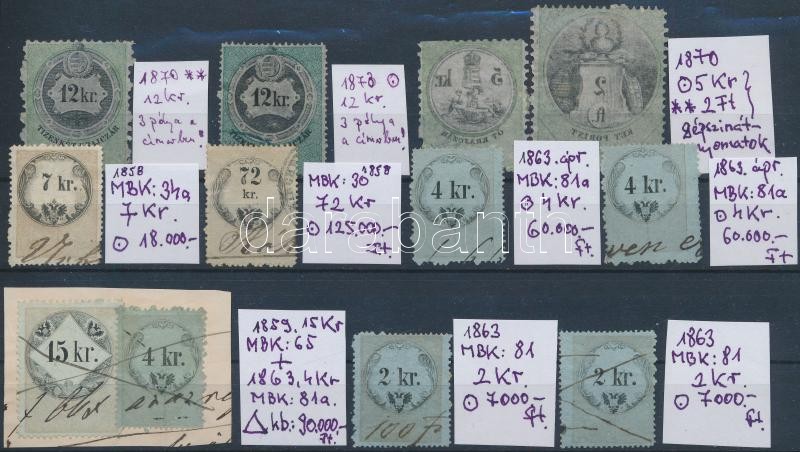Leírás: 1858-1870 12 db okmánybélyeg, ebből 8 beárazva (367.000) / fiscal stamps