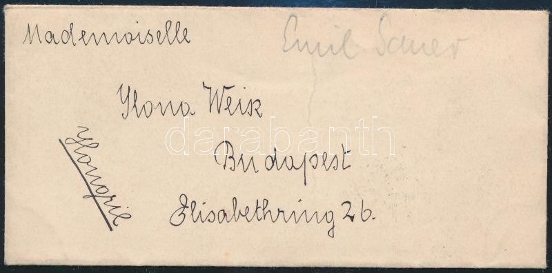 Leírás: 1912 Emil Sauer (1862-1942) német zeneszerző, zongoraművész, zenepedagógus által saját kezűleg aláírt kártya, Weisz Ilona részére elküldve, borítékban