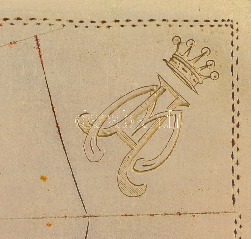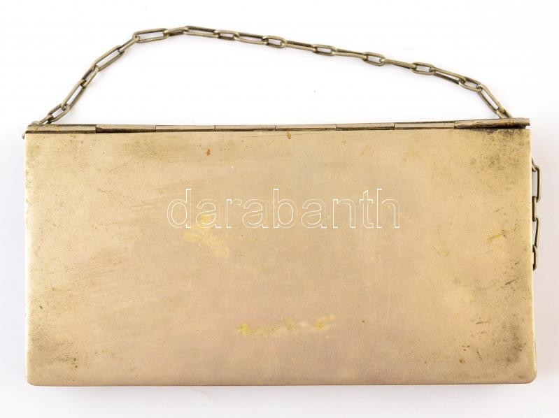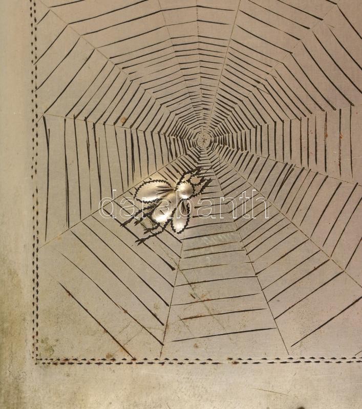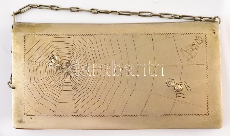Légy a pókhálóban, monogramos ezüst (Ag.) pénztárca bőr belsővel, fém belső szerelékkel és lánccal, jelzés nélkül, kis sérülésekkel, kopásokkal, 16.,5×8×1,5 cm, bruttó 210 g