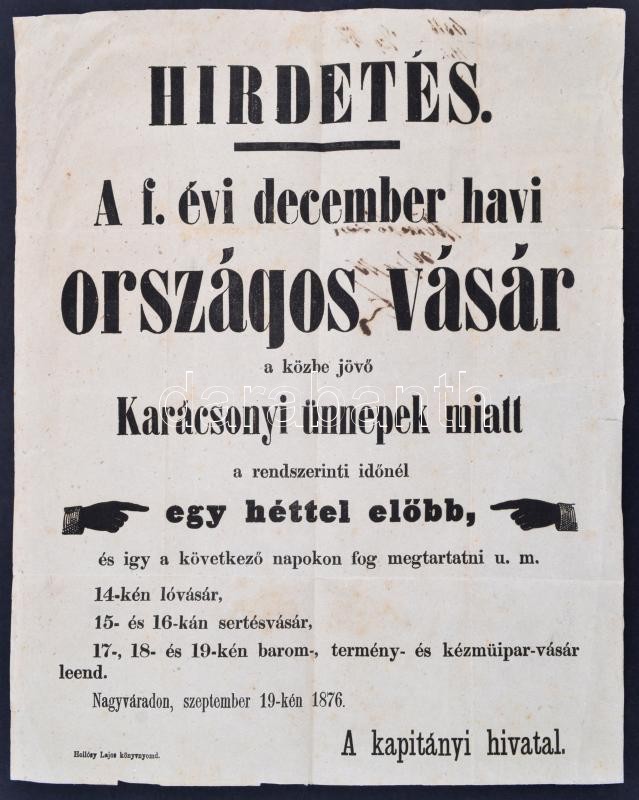 1876 Nagyvárad. Országos vásár hirdetmény. 32x40 cm https://www.darabanth.com/hu/32-Nagyaukcio/32.1/Mutargy-papirregiseg-egyeb/Nyomtatvanyok~13371/1876-Nagyvarad-Orszagos-vasar-hirdetmeny-32x40-cm~II2026621