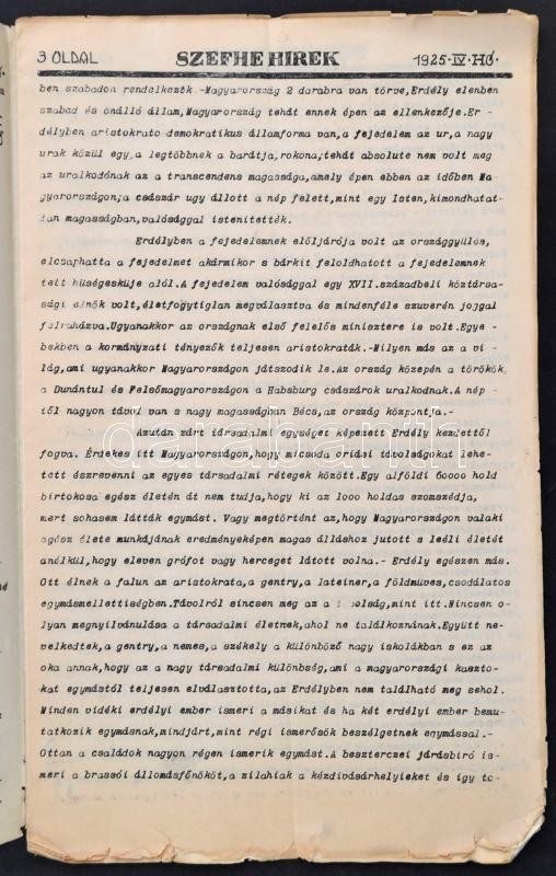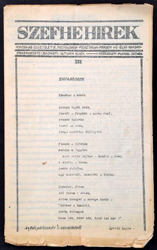 1925 SZEFHE Hírek. 1925. IV. (Április.) Főszerk.: Radnóti István. Szerk.: Puskás István. Kiadja az egyesület (Székely Egyetemista és Főiskolai Hallgatók Egyesülete (SZEFHE) kulturpropaganda főosztálya. A lapok alja szakadozott, 18 p.