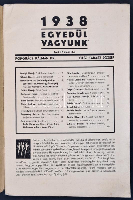 Leírás: 1938 az Egyedül vagyunk szélsőjobboldali folyóirat 1. évf. 1. lapszáma, érdekes írásokkal, kissé foltos papírkötésben