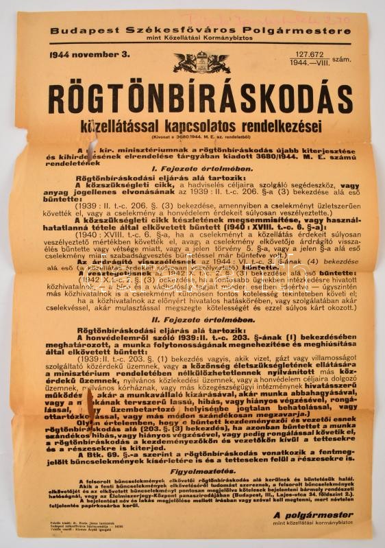 Leírás: 1944 A rögtönbíráskodás közellátással kapcsolatos rendelkezései, fővárosi hirdetmény, hajtott, kis szakadással, 47×31 cm