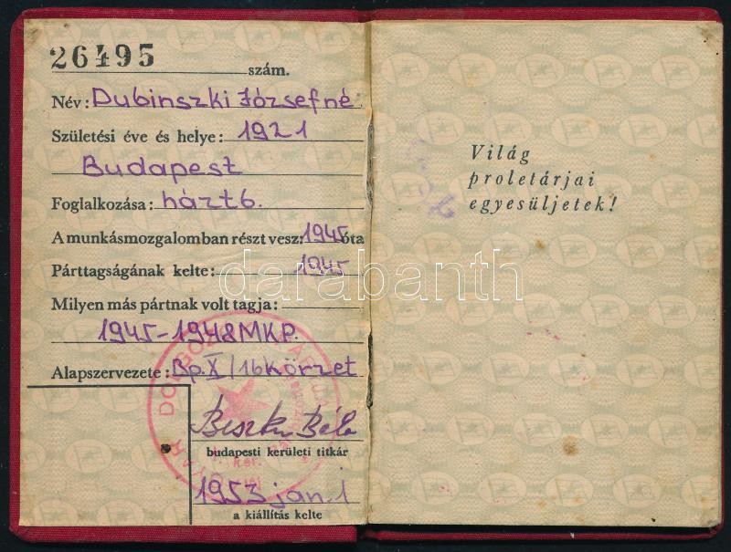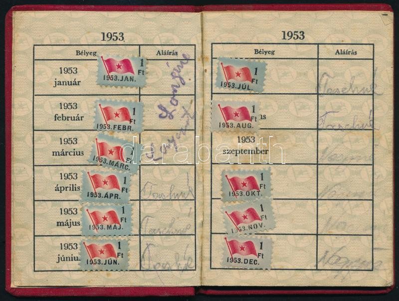 1953 Magyar Dolgozók Pártja tagsági könyv, tagdíjbélyegekkel, Biszku B... https://www.darabanth.com/hu/32-Nagyaukcio/32.1/Mutargy-papirregiseg-egyeb/Okmanyok~13392/1953-Magyar-Dolgozok-Partja-tagsagi-konyv-tagdijbelyegekkel-Biszku-Bela-alairasaval~II2039174