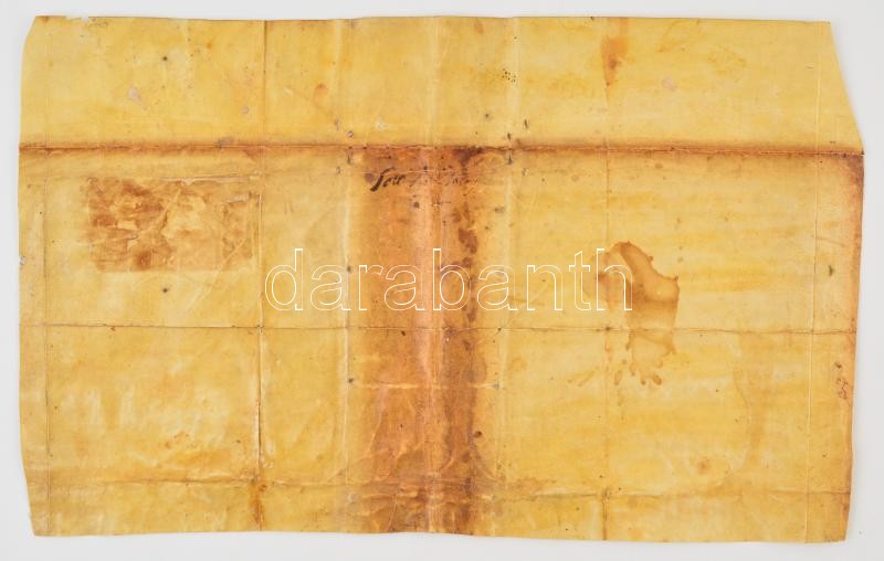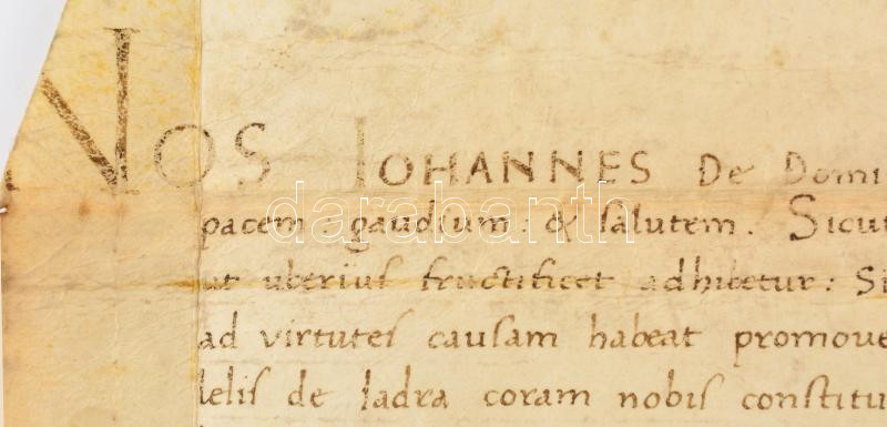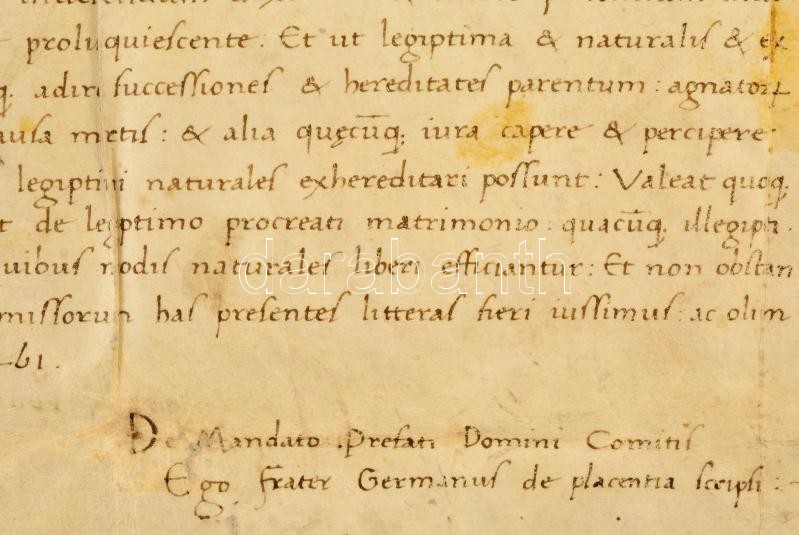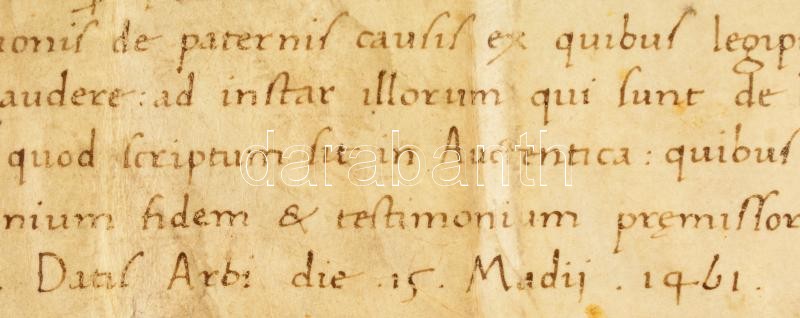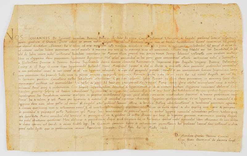 1461 Arbe (ma: Rab, Horvátország), Giovanni de Dominis arbei palotagróf (comes palatinus) a zárai Benedetto Galleli (Benedictus de Gallelis de Iadra) kérésére törvényesíti Giovanni Vallaresso velencei patrícius törvénytelen lányát, Mariát; pergamen, latin nyelven, kancelláriai jegyzettel, pecsét befüggesztésének helyével / 1461 Arbe (nowadays Rab, Croatia), charter issued by Giovanni de Dominis, comes palatinus of Arbe concerning the legitimation of Maria, the illegal daughter of Giovanni Vallaresso, Venetian patrician on demand of Benedetto Galleli of Zara; parchment, in Latin, with chancery notes, with the place of the seal