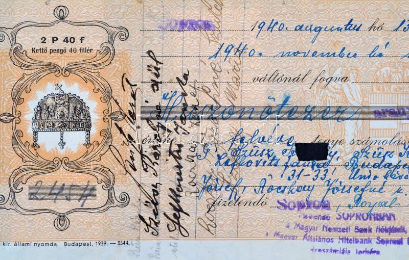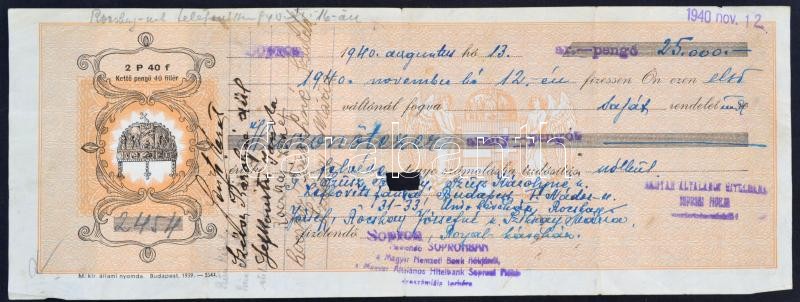 Leírás: 1940 Sopron, Royal-kávéház Szüsz-Rocskay adásvételi szerződés váltója, 25.000 pengő értékben, aláírásokkal, váltó illetékekkel, középen kis hiánnyal.