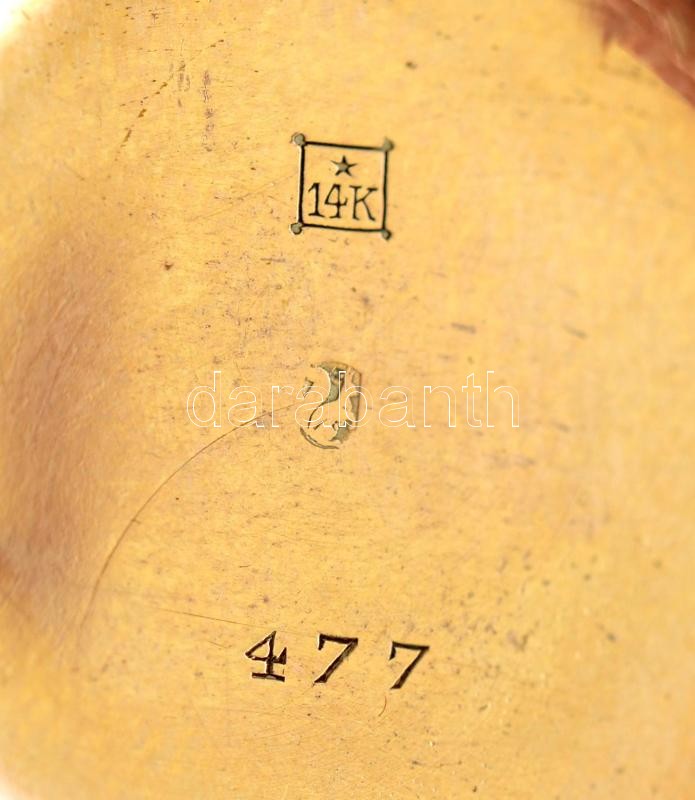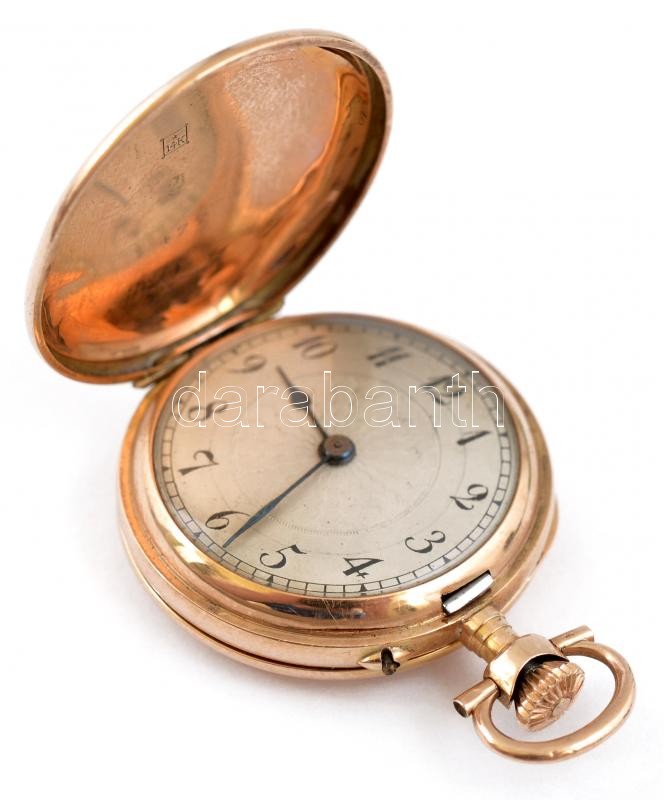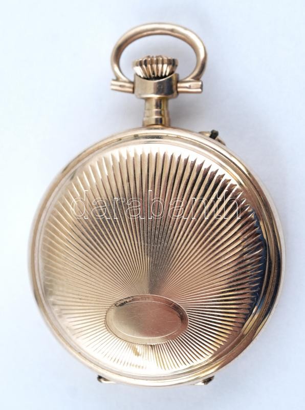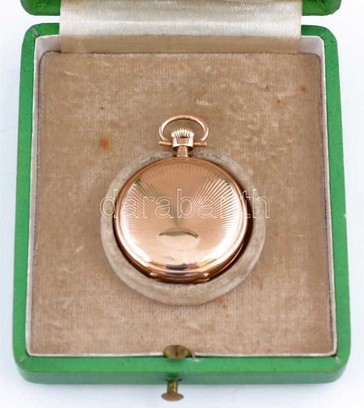 14 K arany, női zsebóra. Vésett tokkal, működő, szép állapotban, óratartó dobozzal / 14 C women's golden pocket watch in nice condition d:30 mm, 20,48 g