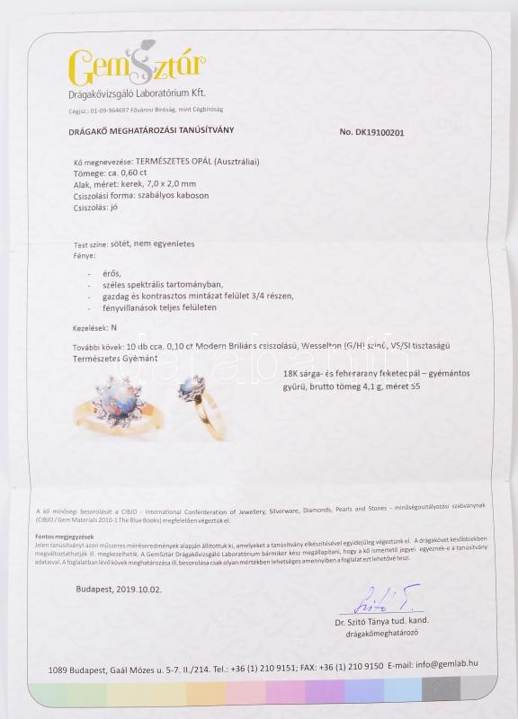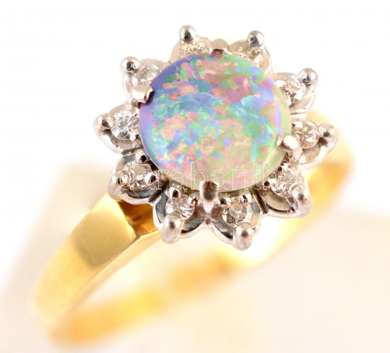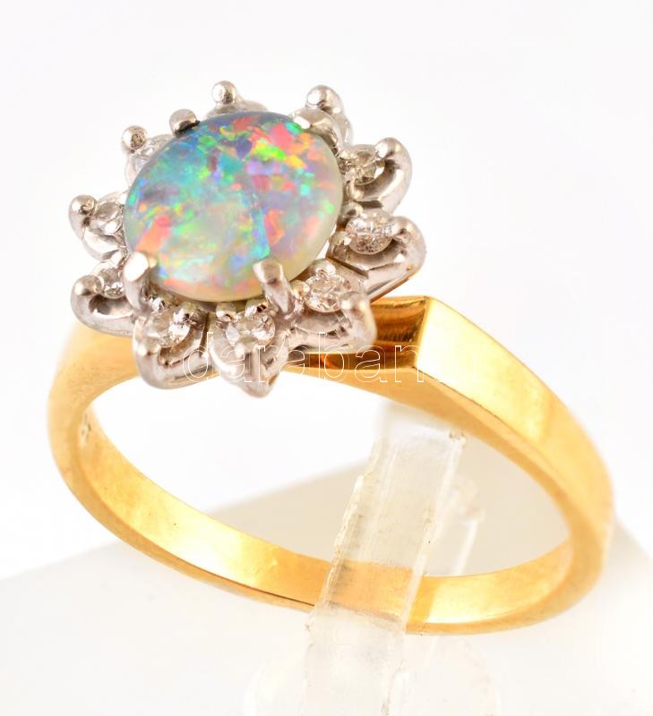 Leírás: Arany és fehérarany (14 K) gyűrű, jelzett, természetes opállal (0,6 ct) és 10 db cca 0,10 ct brillel, méret:55, bruttó: 4,1 g, tanúsítvánnyal