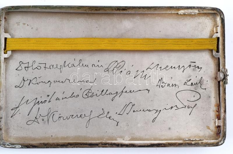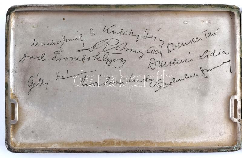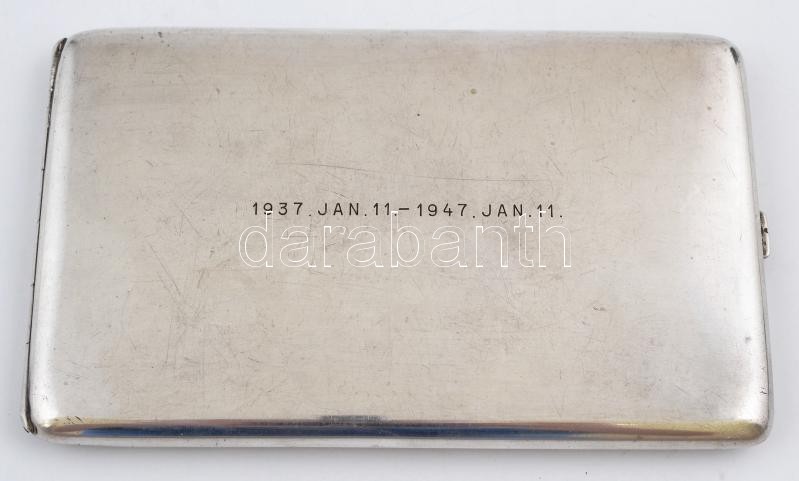 Ezüst (Ag.) cigarettatárca, belül Nyírő Gyula orvos kollégáinak aláírásaival, fedelén "1937. jan. 11.-1947. jan. 11." felirattal, jelzett, 9×14,5×1 cm, bruttó 222,4 g