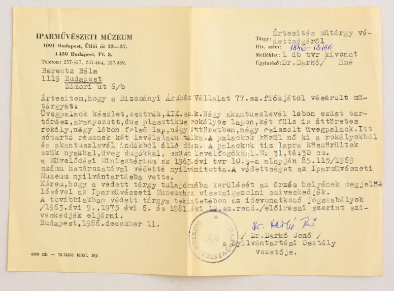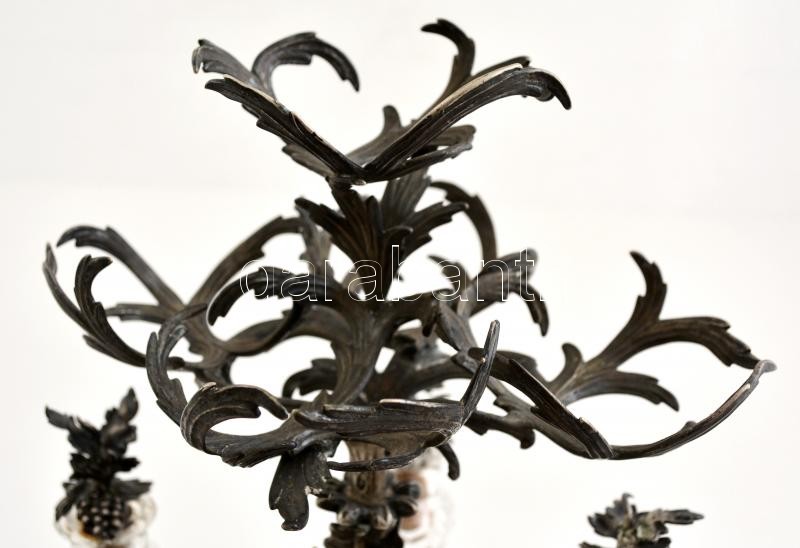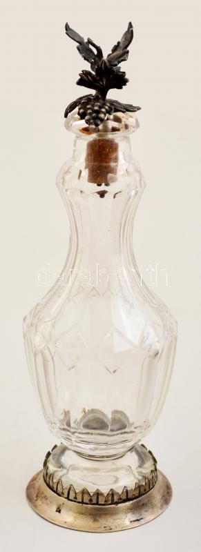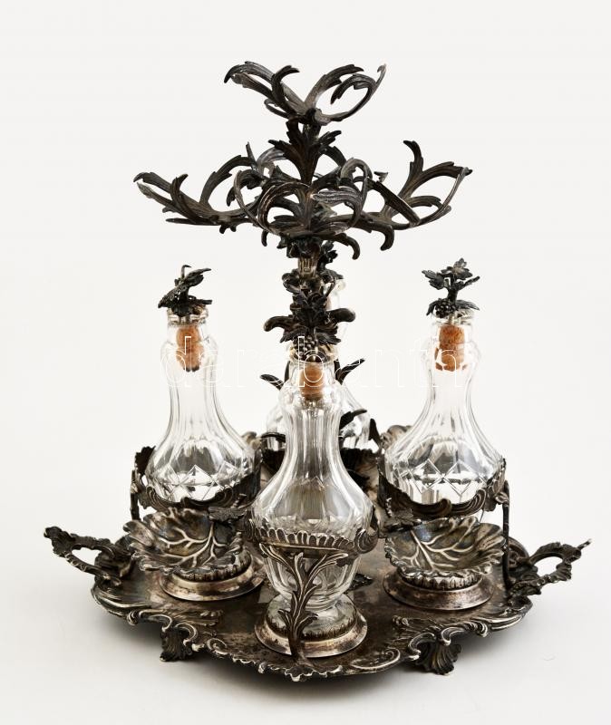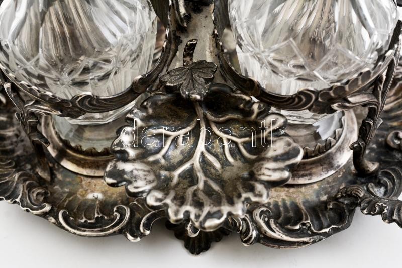 cca 1850 ezüst (Ag.) augsburgi olaj-ecet tartó, eredeti köszörült üveg palackokkal, aprólékos ötvös munka, jelzett, mesterjeggyel, jó állapotban, nettó: 1440 g, m:30 cm, 28×22 cm 1986-os Iparművészeti Múzeumos védettségi papírral, (védettség időlözben törölve) / Handmade silver oil and vinegar jug, with original glasses, hallmarked, in good condition, 1440 g net