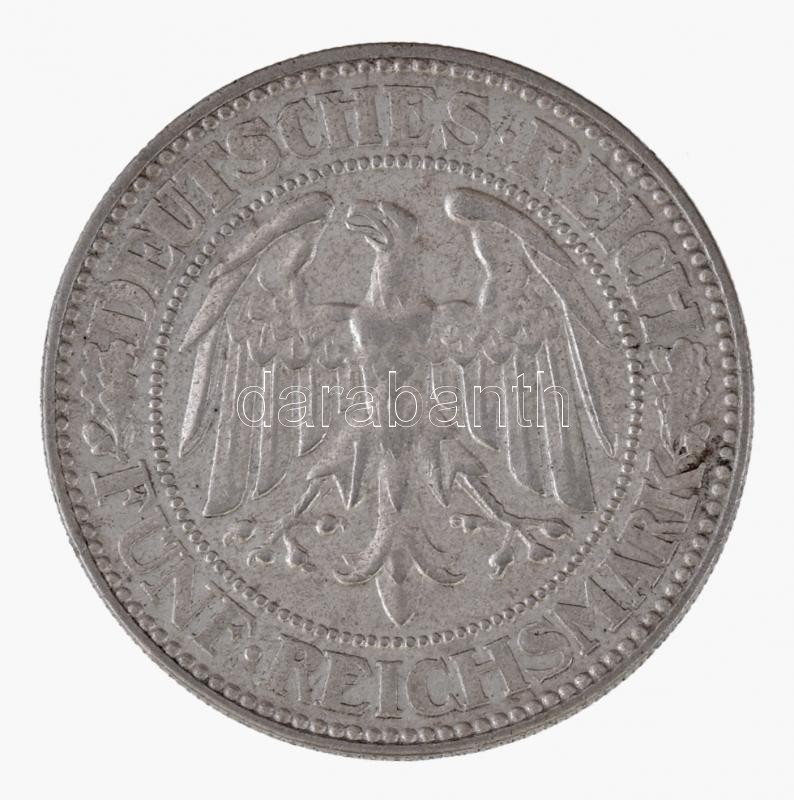 Németország / Weimar Köztársaság 1929A 5M Ag (24,85g) T:2 kis ph. / Germany / Weimar Republic 1929A 5 Mark Ag (24,85g) C:XF small edge error