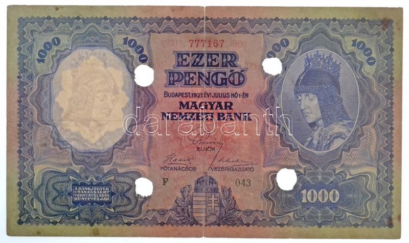 Hungary 1927. 1000 Pengő "F 043 777167" cancelled with four hole C:VF upper tear sticked