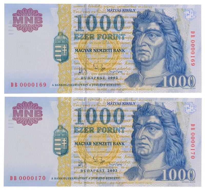 2003. 1000Ft (2x) "DB 0000169 - DB 0000170" sorszámkövetők T... https://www.darabanth.com/hu/32-Nagyaukcio/32.1/Numizmatika/Magyar-es-kulfoldi-bankjegyek~13434/2003-1000Ft-2x-DB-0000169-DB-0000170-sorszamkovetok-TI--Hungary-2003-1000-Forint-2x~II2009214