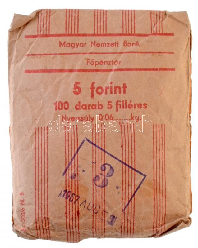 ~1967. 5f Al (100x) eredeti, lezárt "Magyar Nemzeti Bank Főpénztár" papírzacskóban, bélyegzéssel T:1,1- zacskó alján szakadás / Hungary ~1967. 5 Fillér Al (100x) in original, sealed "Magyar Nemzeti Bank Főpénztár" paper bag, with cancellation C:UNC,AU tear on the paper bag