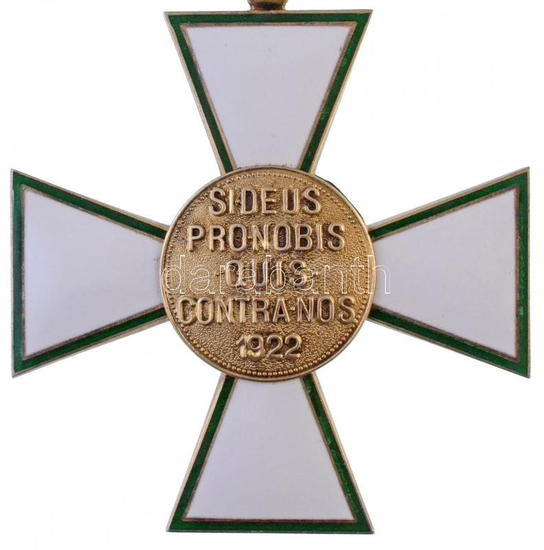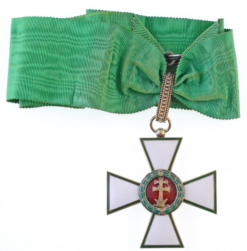 Hungary 1935-1945. "Hungarian Order of Merit, Commander's Cross" enamelled decoration with green neck ribbon (52mm later type) C:AU,XF small enamell error