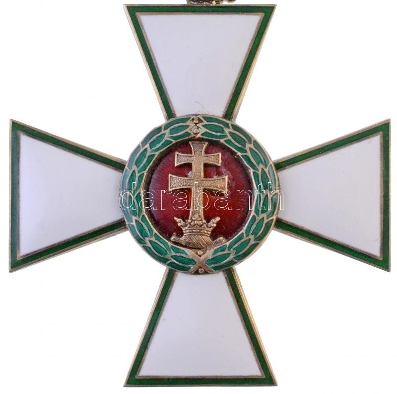 1935-1945. "A Magyar Érdemkereszt II. osztálya - A Magyar Érdemrend középkeresztje" zománcozott kitüntetés zöld nyakszalaggal (52mm-s későbbi típus) T:1-,2 kis zománcsérülés /