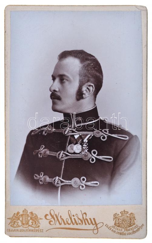 Procopius Béla (1868-1945) numizmatikus huszáregyenruhás, keményhátú fotója, valamikor 1900 után (108x66mm) / Photo of Béla Procopius (1868-1945) numismatist, in Hussar's unifrom, sometimes after 1900 (108x66mm)