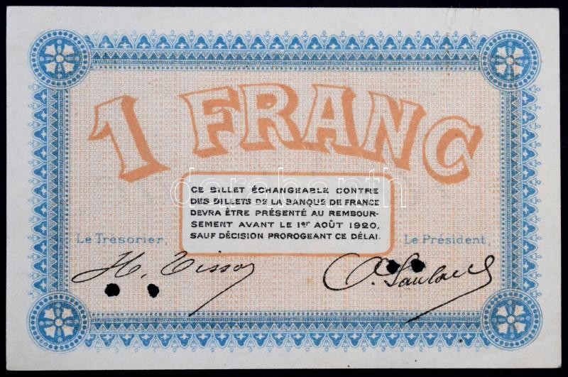 Leírás: Franciaország / Besançon 1920. 1Fr lyukasztással érvénytelenítve T:II / France / Besançon 1920. 1 Franc cancelled with holes C:XF