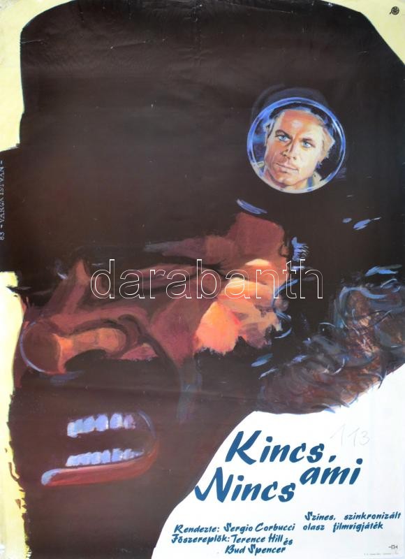 1983 Varga István (?-): Kincs, ami nincs, olasz film plakát, főszerepben: Bud Spencer, Terence Hill, ofszet, gyűrődésekkel, tollas ráírással, szakadással, 80×60 cm