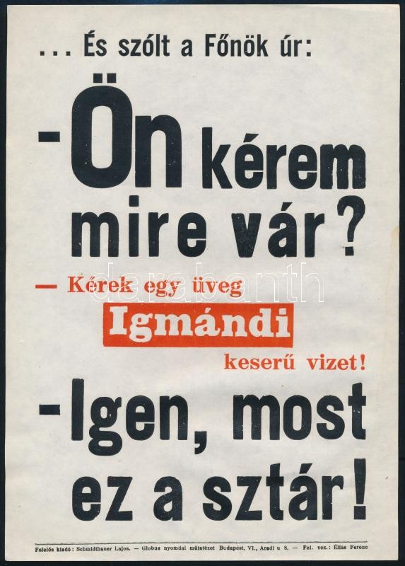 És szólt a Főnök úr..., Igmándi keserűvíz reklámos villamosplakát, Glo... https://www.darabanth.com/hu/32-Nagyaukcio/32.1/Plakat/Plakat~13372/Es-szolt-a-Fonok-ur-Igmandi-keseruviz-reklamos-villamosplakat-Globus-nyomdai-muinte~II2034594