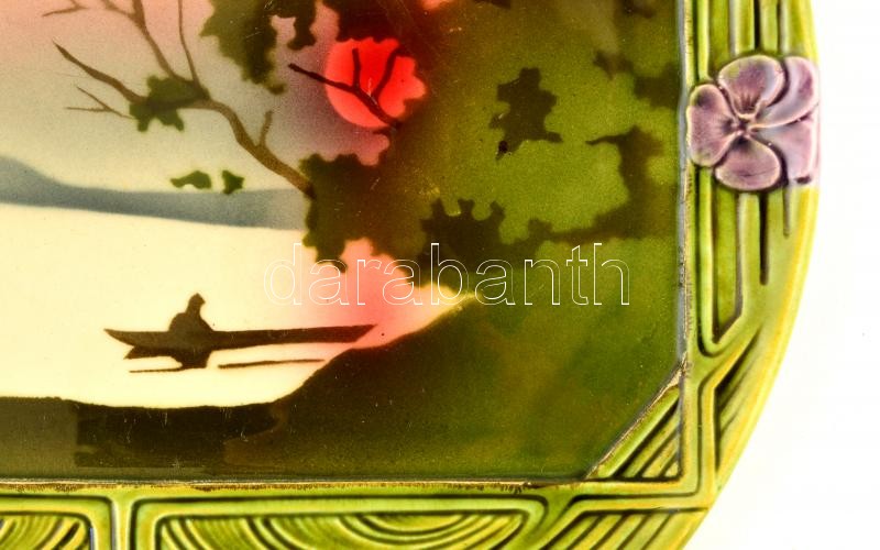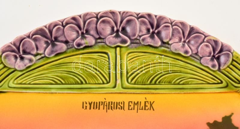 Leírás: Körmöcbányai szecessziós "Gyopárosi emlék" falitál, mázas kerámia, részben kézzel festett, jelzett, a tálon apró méretű lepattanás, d: 26,5 cm