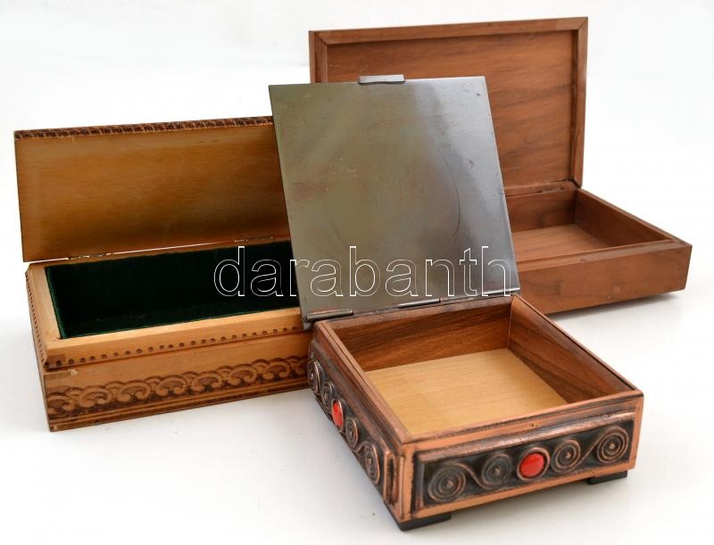 Leírás: 3 db doboz, kettő fa, egy iparművész által tervezett réz doboz, 10×10 cm, 14×10 cm, 18×11 cm