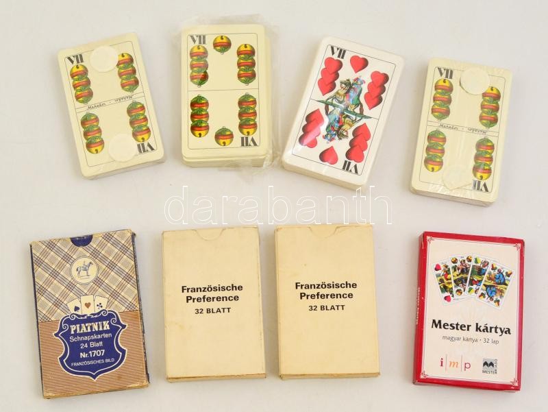 Leírás: 5 pakli magyar kártya eredeti csomagolásában, 2 pakli preferánsz (Piatnik, egyik új), és 1 pakli Piatnik snapszer kártya