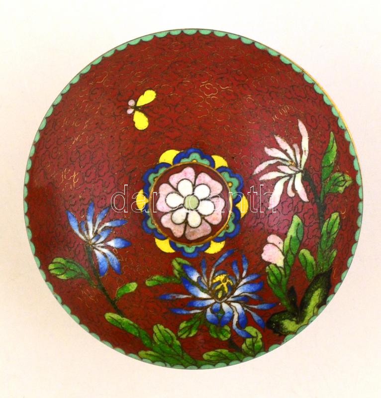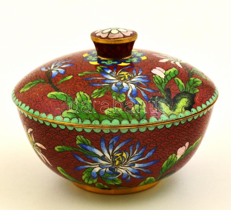 Leírás: Díszes keleti zománcozott réz bonbonier, apró kopásokkal, d: 11,5 cm