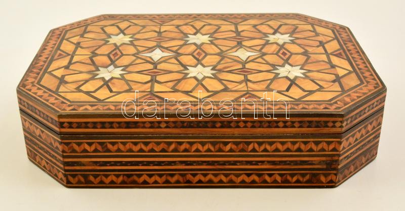 Leírás: Gyöngyház berakásos intarziás fa doboz, 29,5×22 cm