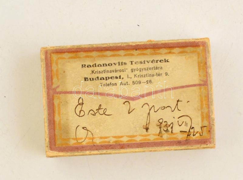 Leírás: Radanovits Testvérek krisztinavárosi gyógyszertára, régi gyógyszeres dobozka