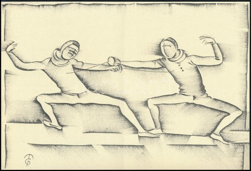 Molnár C. Pál (1894-1981): Párbajtőr. Kis szériás ofszet, 19,5x28,5 cm https://www.darabanth.com/hu/320-Gyorsarveres/320.0/Festmeny-mutargy-papirregiseg-egyeb/Festmenyek-es-grafikak~500001/Molnar-C-Pal-1894-1981-Parbajtor-Kis-szerias-ofszet-19-5x28-5-cm~II1767572