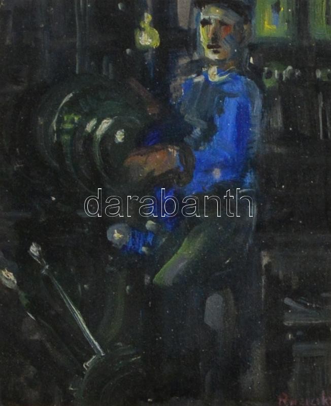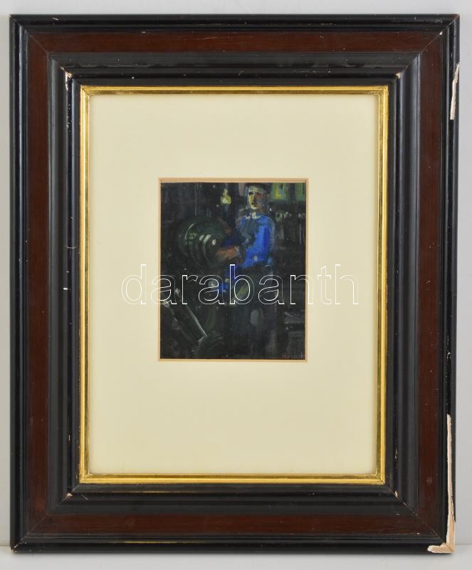 Leírás: Ruzicskay György (1896-1993): Köszörűgépnél. Olaj, karton, jelzett, üvegezett keretben, 16×13 cm