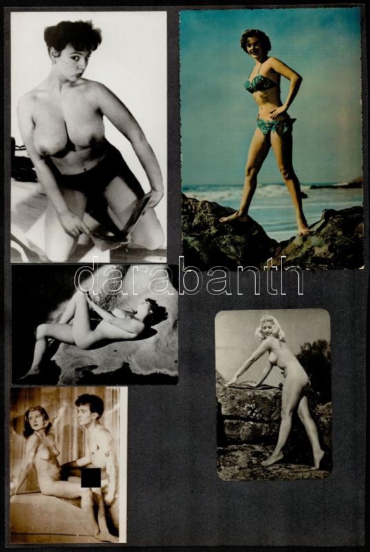 Leírás: 16 db erotikus fotó, kartonlapra ragasztva, 4x4,5 és 15x10,5 cm közötti méretekben