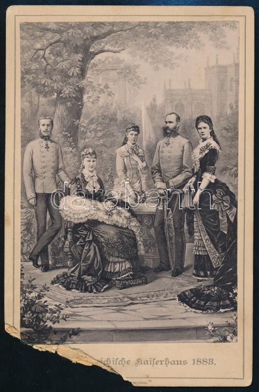 1883 Ferenc József, Erzsébet királyné és családjuk. Fénnyomat. Sérült.... https://www.darabanth.com/hu/320-Gyorsarveres/320.0/Festmeny-mutargy-papirregiseg-egyeb/Foto~500020/1883-Ferenc-Jozsef-Erzsebet-kiralyne-es-csaladjuk-Fennyomat-Serult-16x11-cm~II1768357